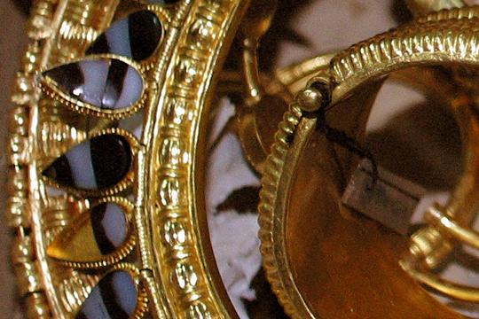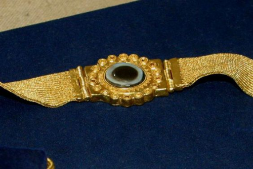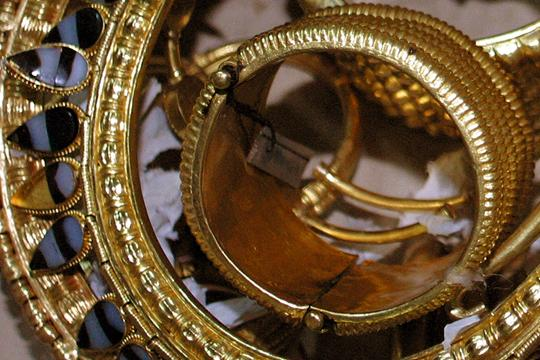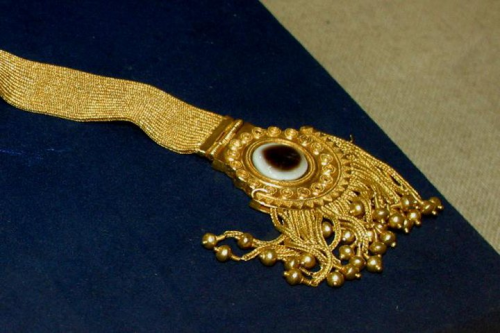 Gold ornaments set with agates. (Photo by Marc DEVILLE/Gamma-Rapho via Getty Images)