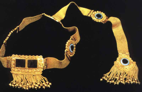 The headdress comes from Queen’s Tomb located in the North-West Palace in Nimrud. Dated to 9th-8th century BCE. Gold, agate, and lapis lazuli; l. of ribbon 40 cm. (ND 1989.5, Iraq Museum inv. no. 105696)