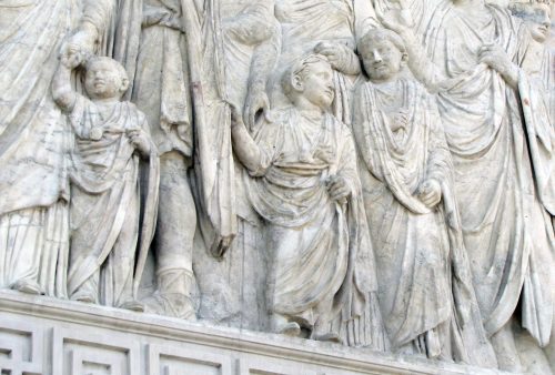 Detail of an altar “Ara Pacis Augustae” (Altar of Augustan Peace) with children: Germanicus wearing a bulla pendant, Cneus Domitius Ahenobarbus, and Domitia(?) wearing a lunula. picture