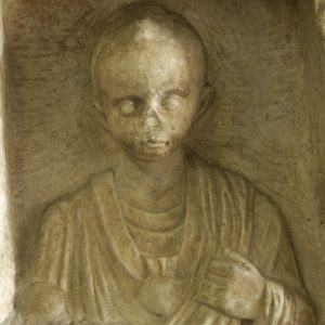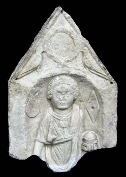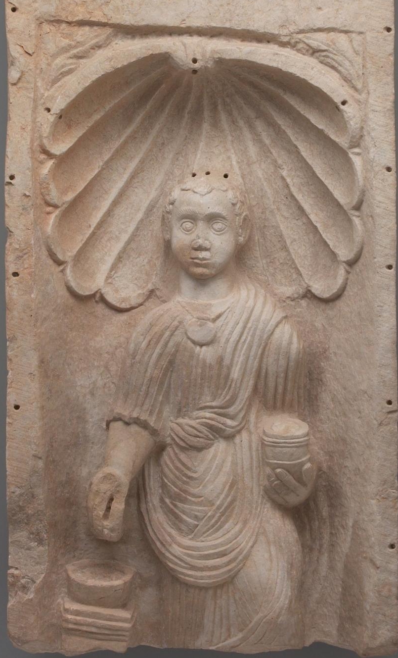 Stele with portrait of a boy. Roman, Tunisian. 3rd century CE. Limestone. The central register depicts a standing boy. He wears a toga praetexta, the standard dress for Roman children who have not yet reached puberty, and holds a scroll in his left hand. He also wears a bulla which rests on his chest.