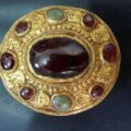 “В комплекс входила круглая серебряная брошь с изображением в низком рельефебюста Афродиты en face с двумя фигурками эротов по сторонам, у правого и у левого плечей (рис. 5,1–2). Прическа богини оформлена по краю лица валиком с косыми насечками, обозначающими пряди волос. На голове – накидка, края которой спадают на плечи. На шее – ожерелье с подвесками. Правая рука с обозначенной на ней браслетом прижата к груди. Справа от обреза бюста по диагонали – прямой жезл с косыми насечками. По краю напаяна рубчатая проволока с концами встык. На оборотной стороне припаяна пружинная фибула смычкового типа, рядом прикипела бронзовая монета (рис. 5,3). Щиток броши вытиснен штампом из тонкогосеребряного листа.