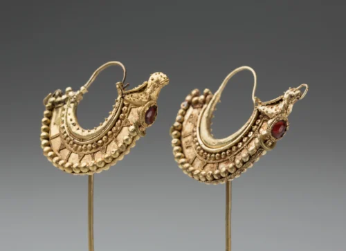 Nabataean, Roman, Earrings, 50 – 150 CE, gold, garnet; 2.9 × 3.7 × 0.6 cm.