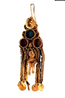 “A second-century A.D. golden earring with glass inlay and figurine, found in a woman’s grave at the necropolis of Ust-Alma.”