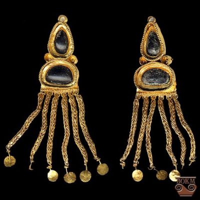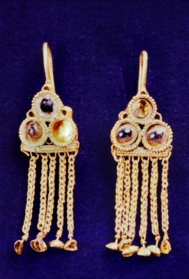 Gold woven chain triangular earrings with pendants and garnet insets. Jewelry of the Black Sea nomads (Sarmatian?), 4th Century AD – 5th Century AD. Found in 1904 AD, in Kerc, the ancient Pantikapeion. Roman-Germanic Museum (Römisch-Germanisches Museum), Köln, Germany.
