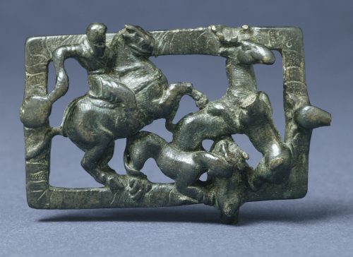 Buckle with boar hunting scene, 2nd-1st century BCE. Tajikistan, Saksanokhur – National Museum of Antiquities of Tajikistan (Dushanbe)