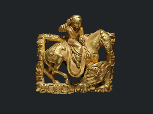 The golden belt buckle from Tajikistan, Saksanokhur, dates from the 1st to 2nd century CE (the Kushan period), shows a rider who is about to deal the death blow to a boar. The frame is provided with an egg dart motif and was originally decorated with inlays. source >>