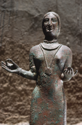 “Bronze statue of a female worshipper in the act of burning a pinch of frankincense. The woman wears necklaces and a round pendant with rays, probably an amulet” (National Museum of Yemen, Ṣanʿāʾ, inv. no. YM 289)