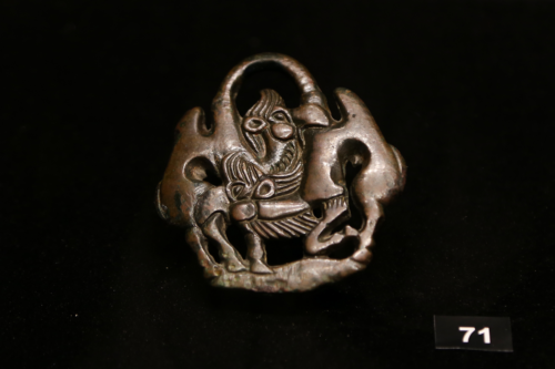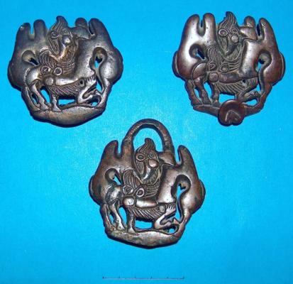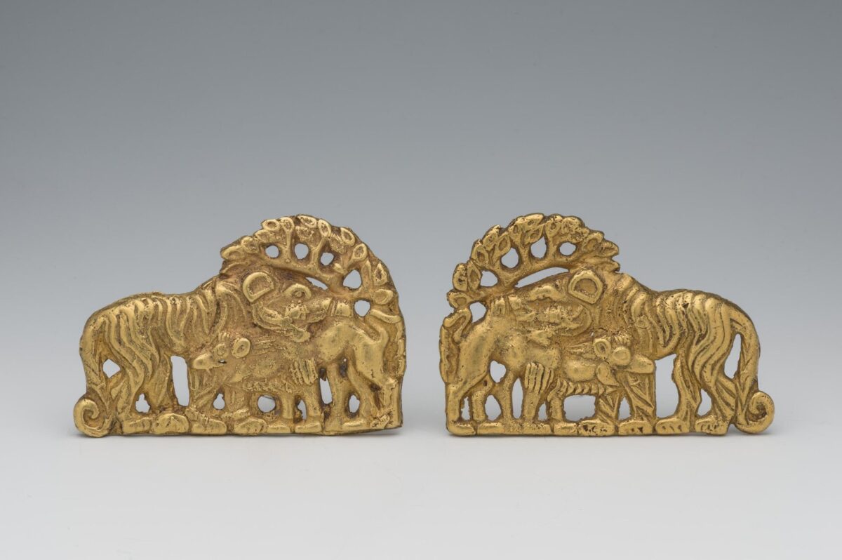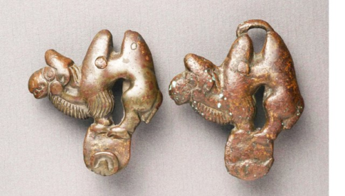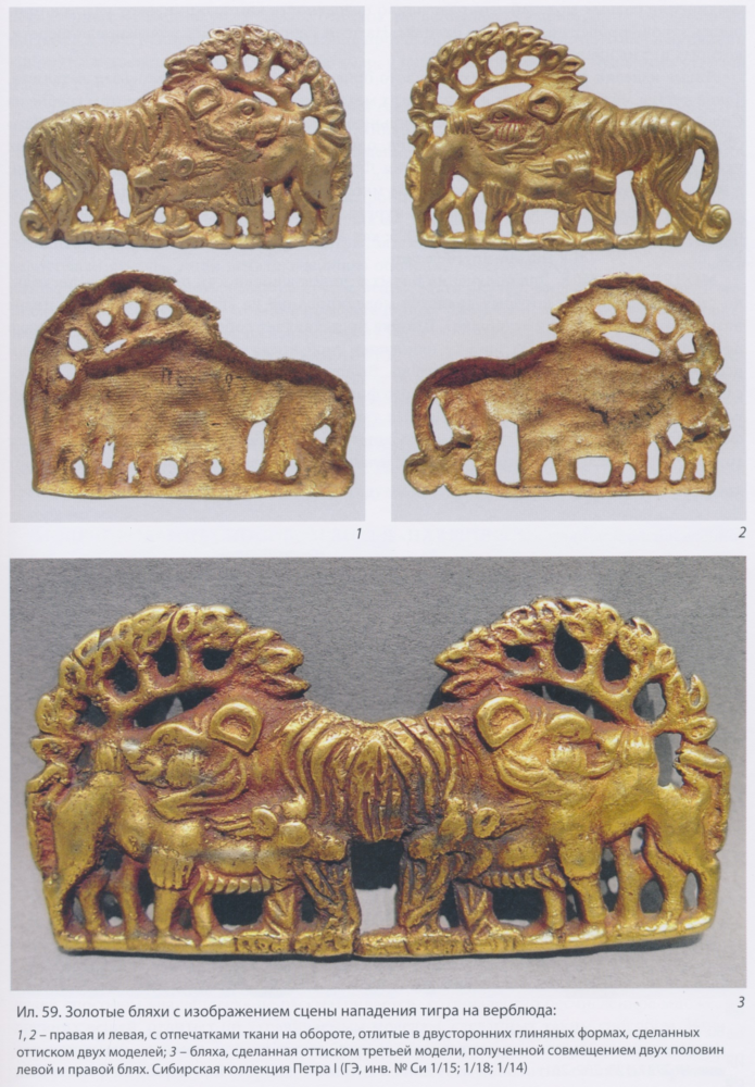 Belt plates from Isakovka depicting a fight between a camel and a fantastic wolf predator. Such scenes are well known in the art of Central Asia, but usually involve a camel and a feline predator. [Mordvintseva V. I.]