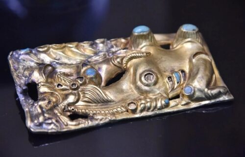 Belt plates, 2nd-4th century. Gold, silver, turquoise. Burial 6, mound 3, Isakovka burial ground, Sargat culture.