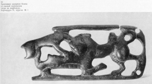 A horned wolf tearing apart a camel is the subject of a gold plaque from the Sargat burial ground of Isakovka; images of “deer-horned predators” are also known in the Scythian animal style of the Kuban region and in the art of the forest-steppe Tagar culture. [Cheremisin D.V.]