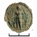 Round fibula-brooch with an image of goddess Tyche / Fortune holding a cornucopia and the rudder. Gold foil on the bronze base. Found in the Roman period sanctuary on Mount Kara-Tau, Crimea. The brooch was left there as a votive [sacrificial] offering. 2nd-3rd century