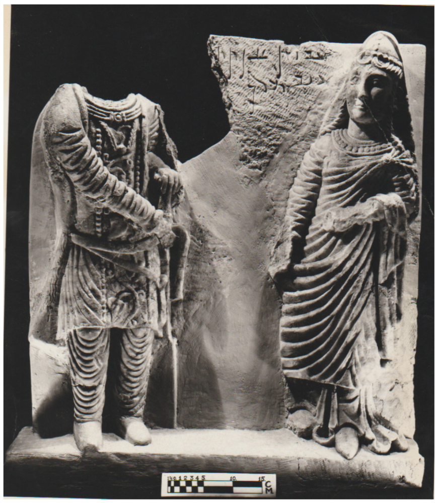 names were preserved. She wears the usual Hatrene costume of a long dress with long sleeves and a himation. Around her neck is a necklace, and her two braids of hair hang on her shoulders. As for ʿbdmalik’s attire, he wears a chiton and trousers and an overcoat with long sleeves. The decorations of his garment are the usual Hatrene ornamentations of the nobles and commanders. He grasps the hilt of his sword with his left hand while the right arm